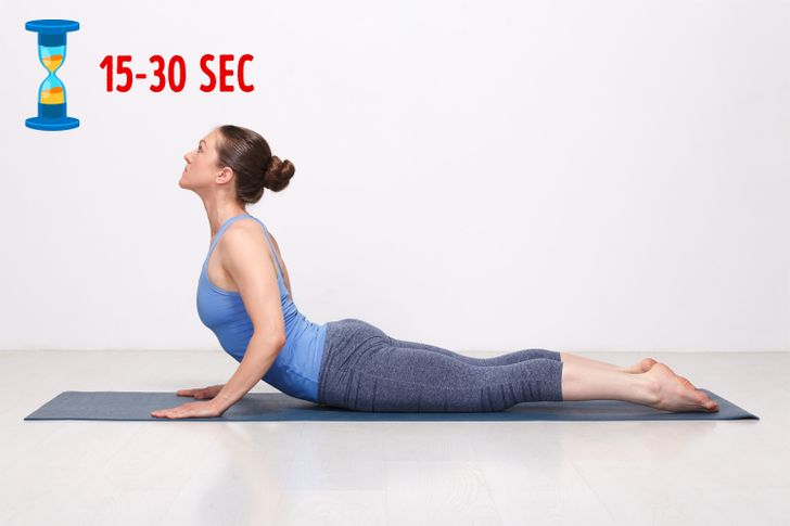 Wykonaj wdech i powoli wróć do pozycji wyjściowej. Ćwiczenie można powtórzyć pięć razy. Zrób 15 sekund przerwy, aby odpocząć. Osoby cierpiące na wrzody żołądka lub urazy kręgosłupa nie powinny wykonywać ćwiczenia kobry.