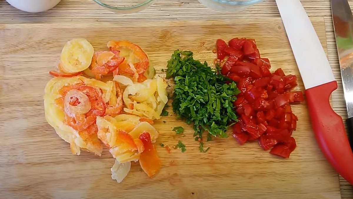 9. Kolejnym dodanym składnikiem, będzie umyta i oczyszczona z nasion papryka, pokrojona w paski oraz posiekana natka pietruszki.
