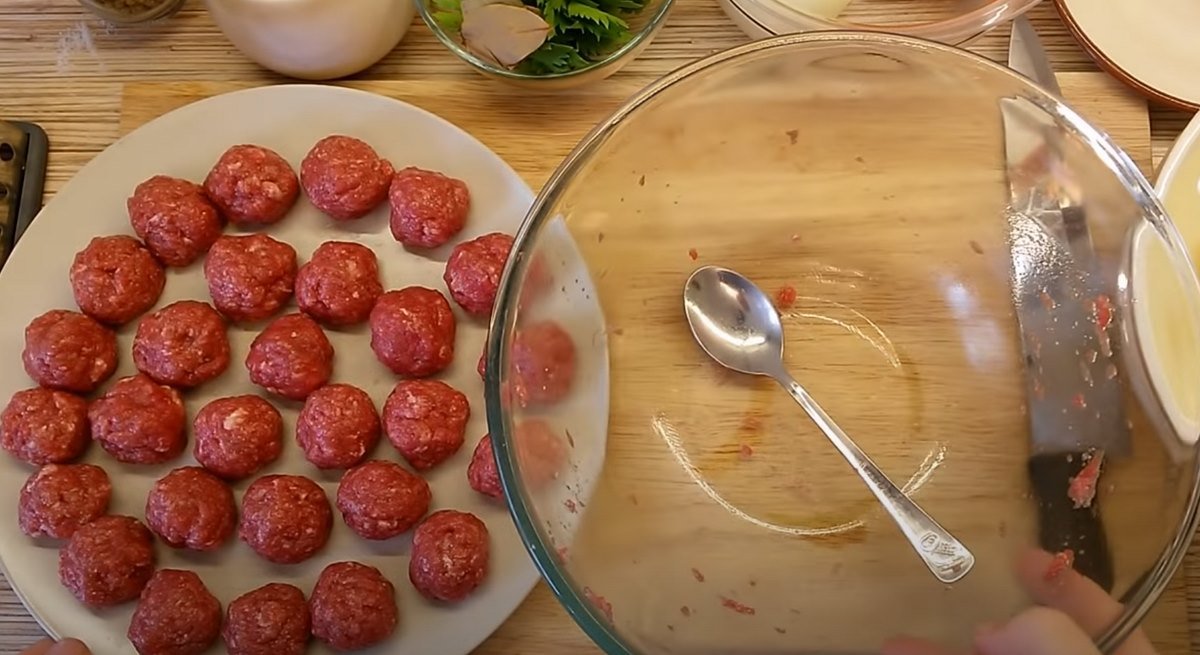3. Z przygotowanego mięsa mielonego, uformuj małe kulki (aby mięso nie przyklejało się do dłoni, zwilż je wodą). Klopsiki poukładaj na talerzu obok siebie i wstaw do lodówki.