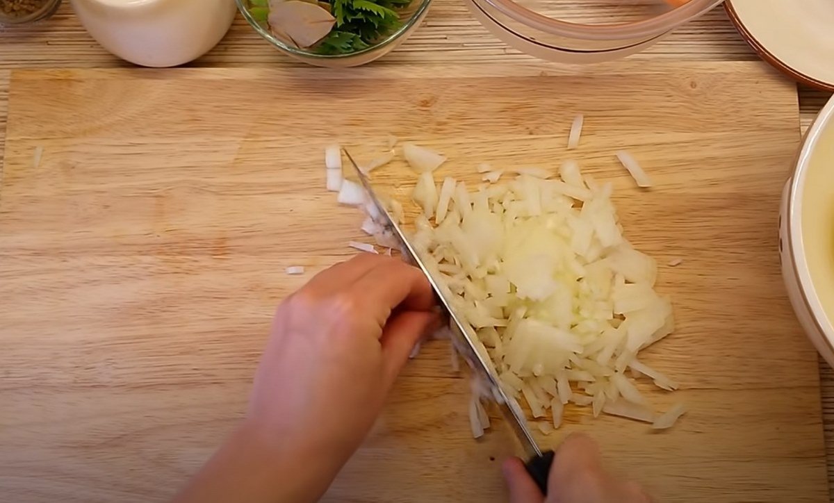 4. W tym czasie, doprowadź do wrzenia wodę w dużym garnku, potem dodaj pokrojoną w kostkę cebulę.