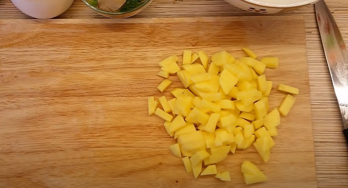 6. Obrane i umyte ziemniaki, pokrój dowolnie: w kostkę lub w paski i dodaj do garnka, doprawiając do smaku solą.