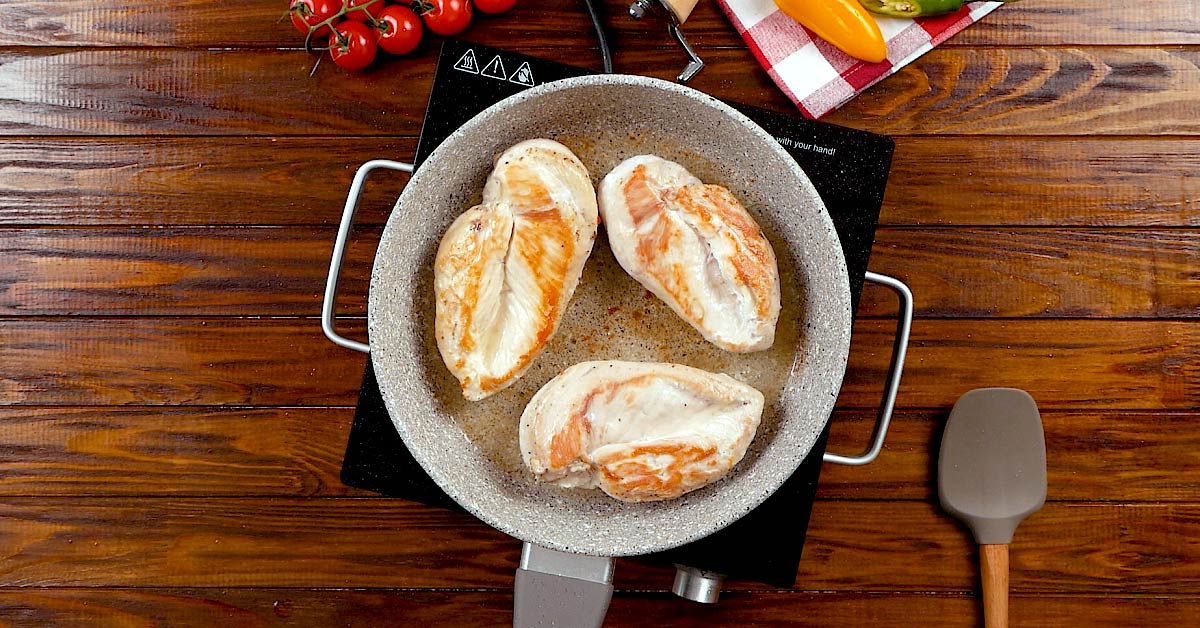 1. Na rozgrzanej patelni z olejem, podsmaż doprawione do smaku solą i pieprzem filety z kurczaka. Zarumienione filety z obu stron przełóż na talerz.