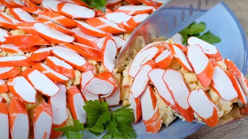4. Na płaskim, dużym talerzu, ułóż sałatkę w kształt rozgwiazdy i udekoruj pokrojonymi w plasterki paluszkami krabowymi. Gotowe!