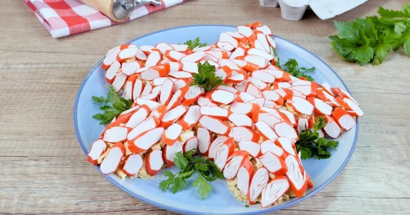 4. Na płaskim, dużym talerzu, ułóż sałatkę w kształt rozgwiazdy i udekoruj pokrojonymi w plasterki paluszkami krabowymi. Gotowe!