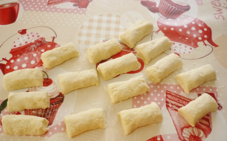 3. Na posypanym mąką blacie roboczym, zagnieć lekkie, elastyczne ciasto. Potem uformuj z niego wałeczki, a następnie pokrój je na mniejsze kawałki.