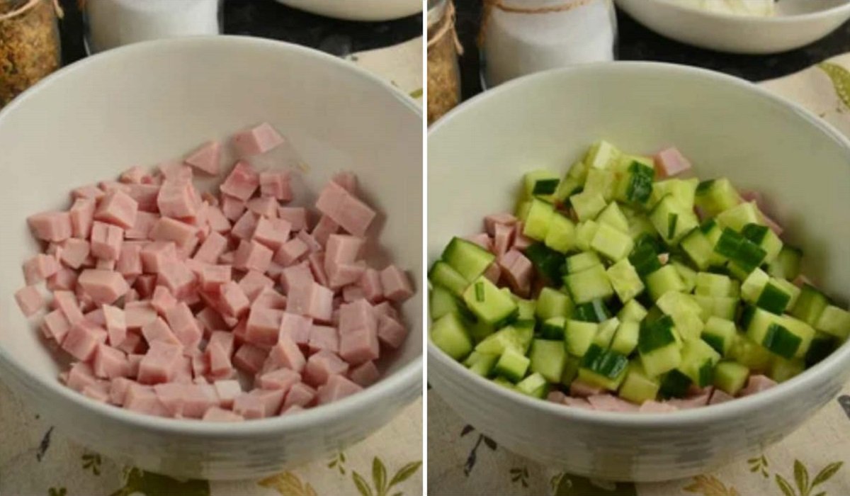 1.Szynka oraz ogórek pokrój w kostkę i przenieś do miski.