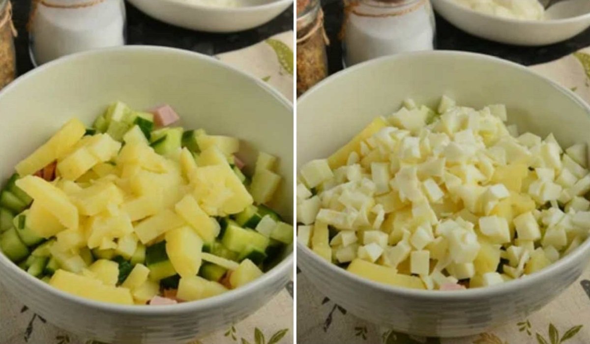2. Ugotowane oraz pokrojone również w kostkę ziemniaki dodaj także do miski. Na twardo ugotuj jajka, następnie oddziel żółtka od białek. W kosteczkę pokrój białka i dodaj do pokrojonych składników.