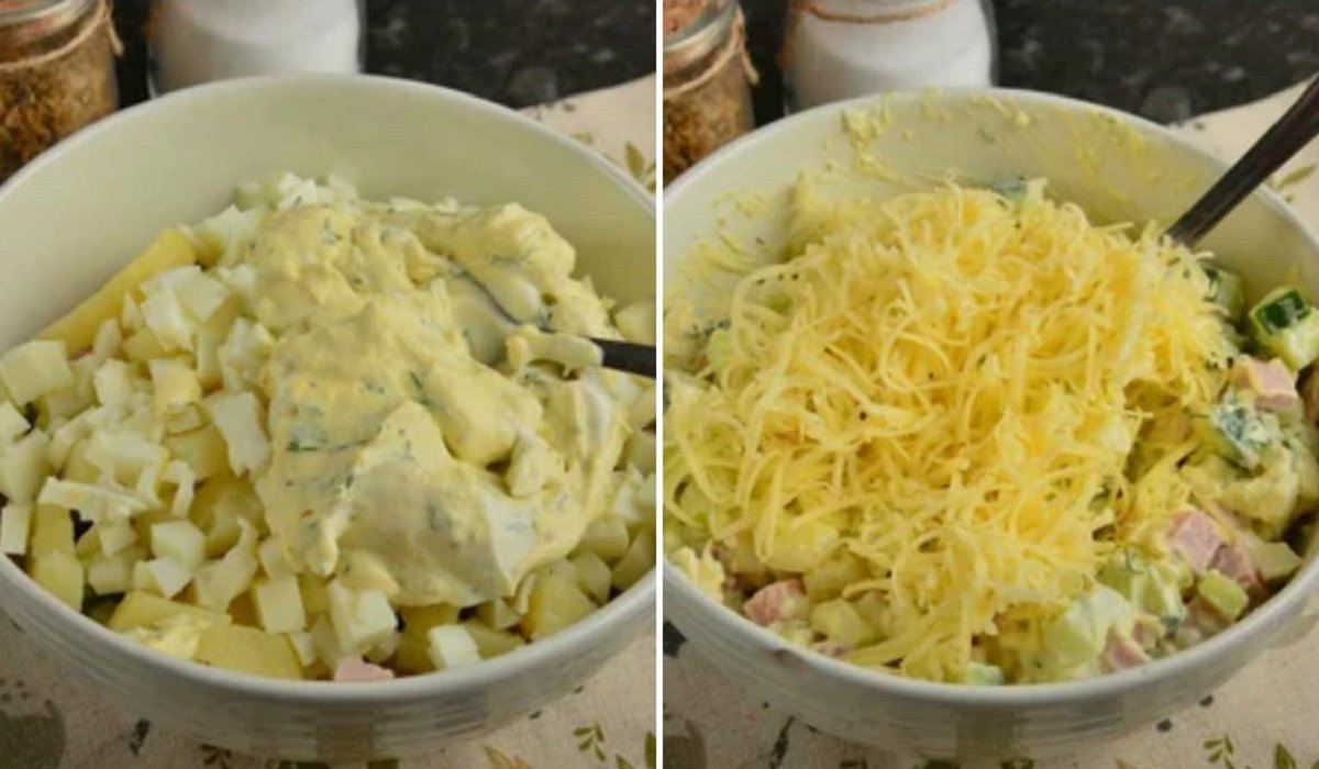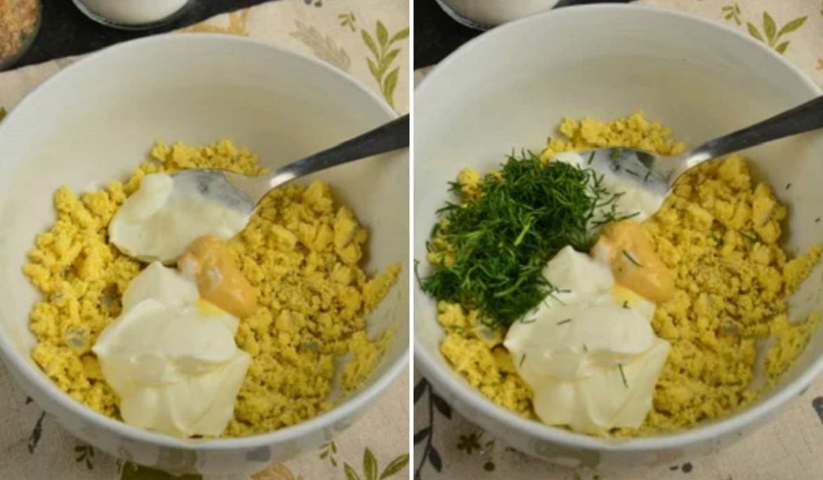 3. W tym momencie przygotuj dressing: Śmietanę , musztardę, starte żółtka na tarce oraz posiekany drobno koper wymieszaj w osobnej misce.