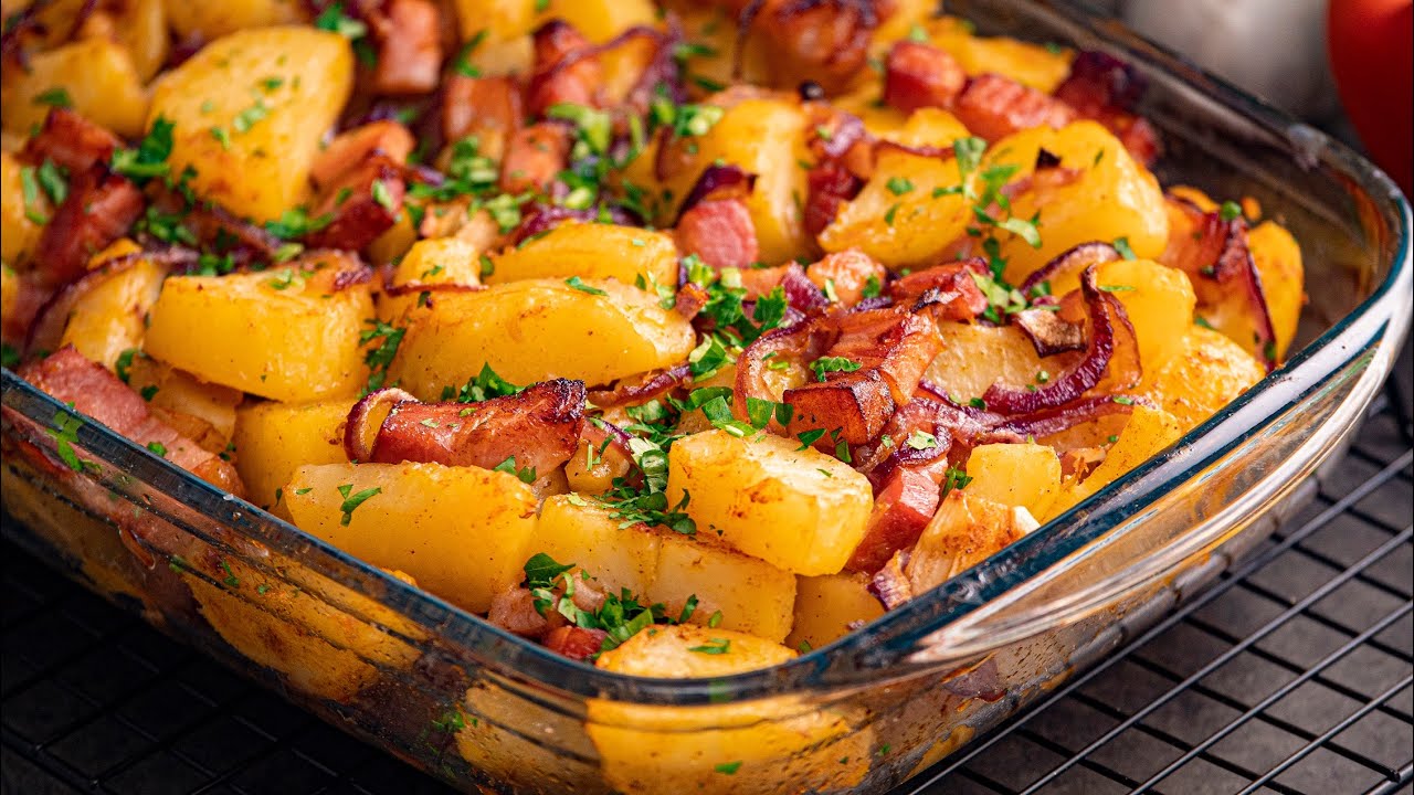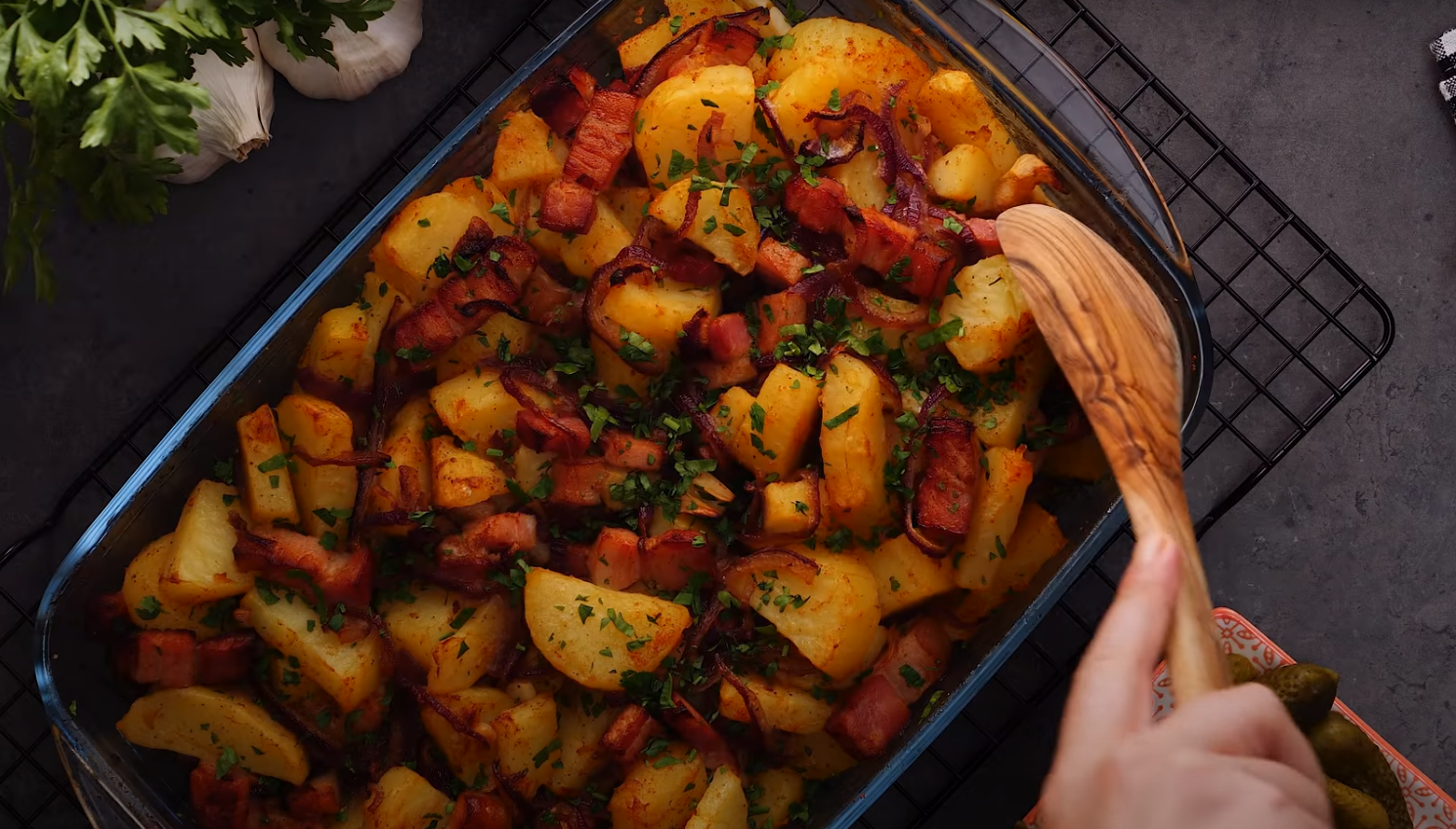 2.W naczyniu żaroodpornym ułóż ziemniaki. Przypraw wędzoną papryką oraz solą. Do ziemniaków dodaj podsmażony boczek oraz cebulę. Całość wymieszaj i piecz w 190 stopniach przez 45 minut.