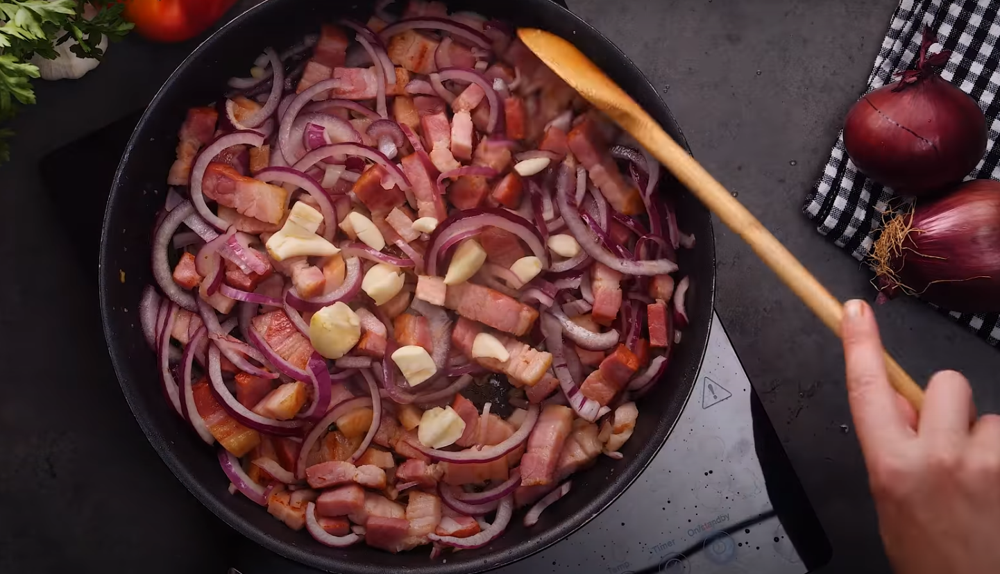 1. Porcja składników zależy od ilości osób. Na patelni podsmaż boczek. Gdy wytopi się tłuszcz dodaj pokrojoną cebulę. Pod koniec smażenia dodaj przeciśnięty czosnek ( uważaj, żeby się nie przepalił). Obierz, umyj następnie ugotuj ziemniaki przez 25 minut pamiętaj, żeby je posolić.