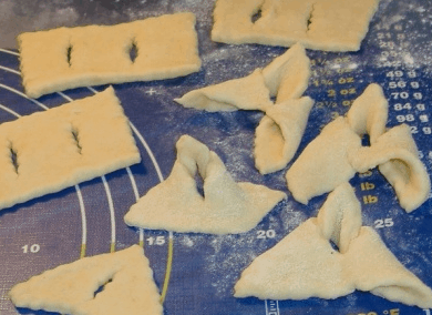 2. Blat posyp mąką i rozwałkuj na niej ciasto, następnie wytnij dowolnej wielkości prostokąty. Na środku każdego prostokąta natnij kawałek i połowę ciasta przełóż przez dziurkę.