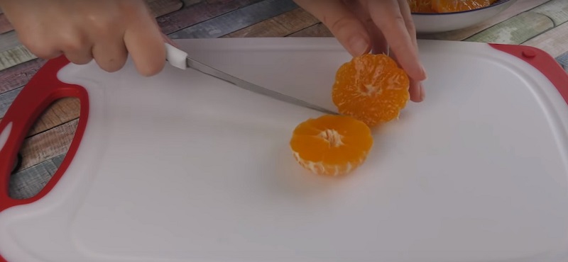 1. Obierz mandarynki ze skórki, wraz z białymi cząstkami w środku. Przekrój je na pół i jeśli to konieczne, usuń pestki.