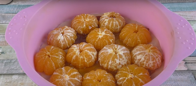 6. Poukładaj ciasno połówki mandarynek na całej blaszce (lub formie).