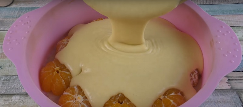 7. Zalej mandarynki ciastem i delikatnie wygładź. Piecz ciasto w temperaturze 180 stopni przez 35–40 minut. Obniż nieco temperaturę na 10 minut przed końcem pieczenia.