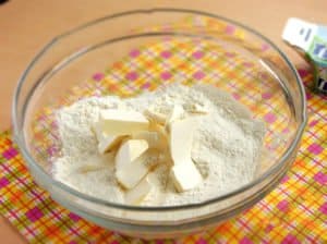 W misce wymieszaj 200 g mąki. Dodaj posiekane masło. Wymieszaj składniki razem, aż uzyskasz kruchą masę.