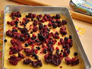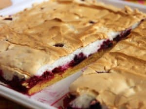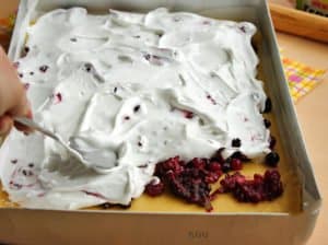Białka i cukier zmiksować na sztywno. Stopniowo dodawaj skrobię. Na dnie rozłożyć owoce, a następnie przykryć danie pianą. Piec blachę przez 40 minut w piekarniku.