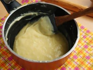 W tym czasie wymieszaj w mleku cukier, żółtko, cukier waniliowy i mąkę. Gdy mleko ostygnie, zagotuj je, aby powstał gęsty budyń. Po ostygnięciu można go wymieszać z masłem.