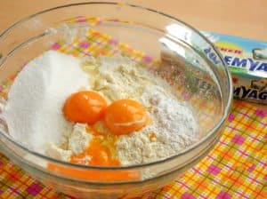 Następnie dodaj cukier, pianę z białek, proszek do pieczenia i pozostałą mąkę. Jeszcze raz zagnieść rękami.