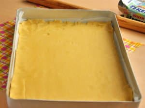 Upiecz na blasze o wymiarach 25 cm x 30 cm. Przykryj ciasto papierem do pieczenia. Brzegi można lekko docisnąć palcami.