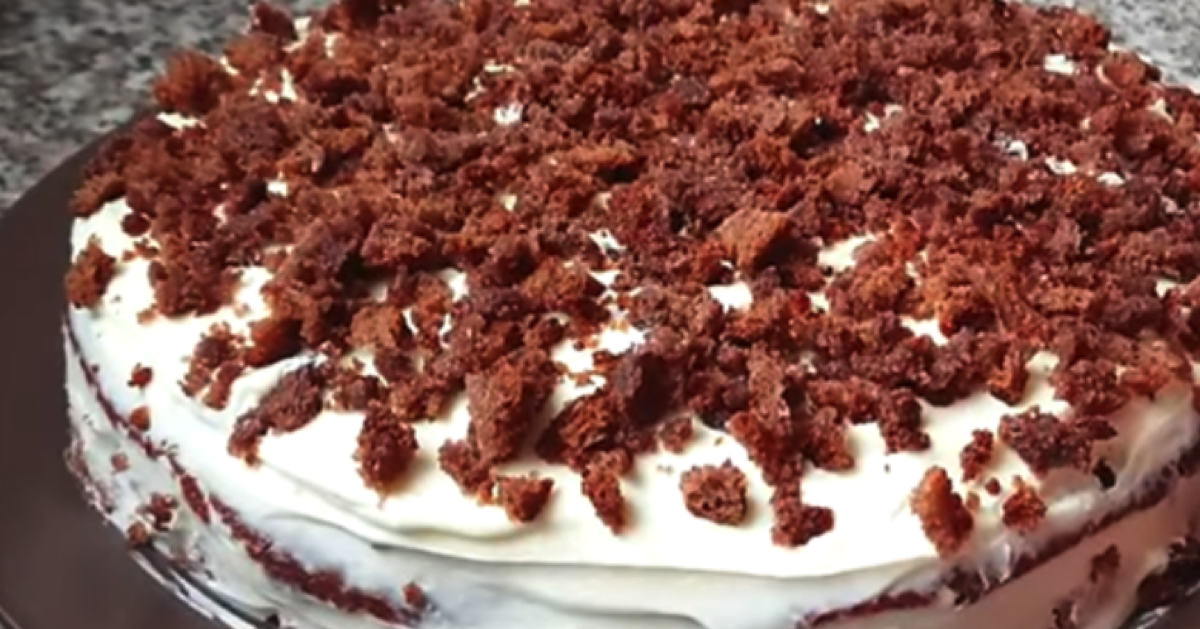 5. Wyjmij ciasto z piekarnika i pozwól mu wystygnąć. Potem, odetnij (wyrównując powierzchnię) górę i boki ciasta i przekrój je na pół. Przygotowanym wcześniej kremem, wysmaruj jedną część ciasta i przykryj je drugim. Pozostałym kremem, wysmaruj górę i boki ciasta, a odkrojone kawałki ciasta zblenduj i posyp równomiernie całą jego powierzchnię. Gotowe!