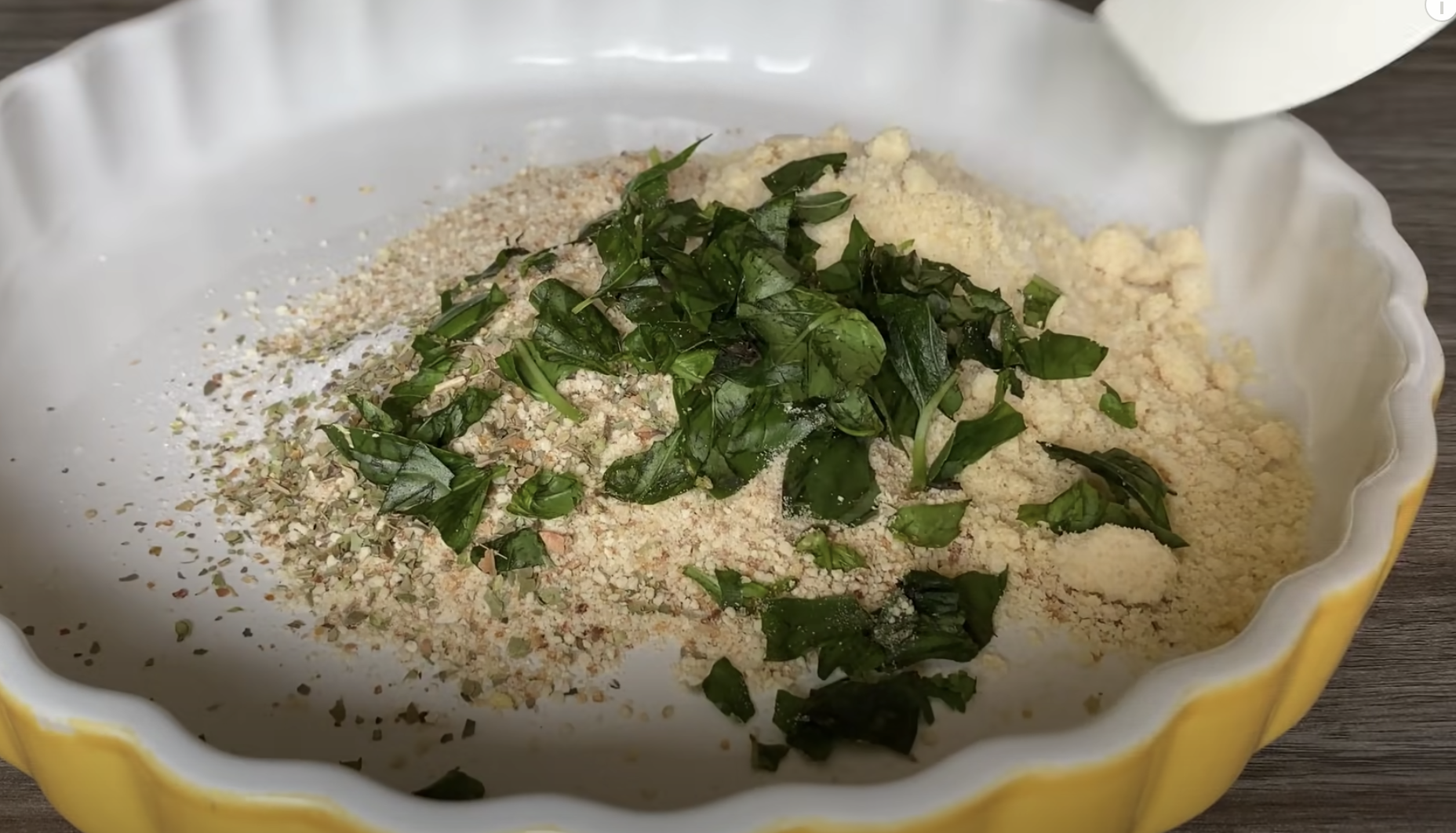 Połącz bułkę tartą, parmezan i zioła z rozgniecionym czosnkiem.
