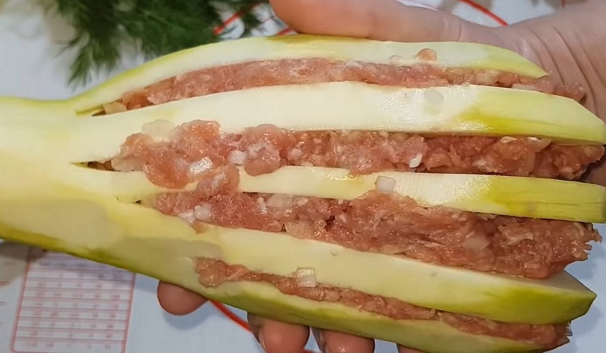 2. Cukinię obierz ze skórki i jej grubszą stronę natnij wzdłuż w kilku miejscach w wachlarz (jak na zdjęciu). W wykonane nacięcia, włóż warstwę mięsa mielonego i poukładaj na blaszce, przykrytej papierem do pieczenia. Z wierzchu, przykryj cukinie folią aluminiową.