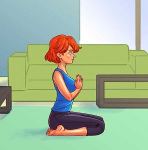 Usiądź na kolanach, nogi lekko rozsuwając na boki, pośladkami dotykając podłoża. Złóż dłonie razem na wysokości klatki piersiowej, w pozycji modlitewnej. Wyciągnij szyję oraz plecy. Oddychaj głęboko. Czas wykonywania: 1 minuta. Korzyści: zniwelowanie bólu bioder, rozciąganie mięśni nóg oraz lędźwi.