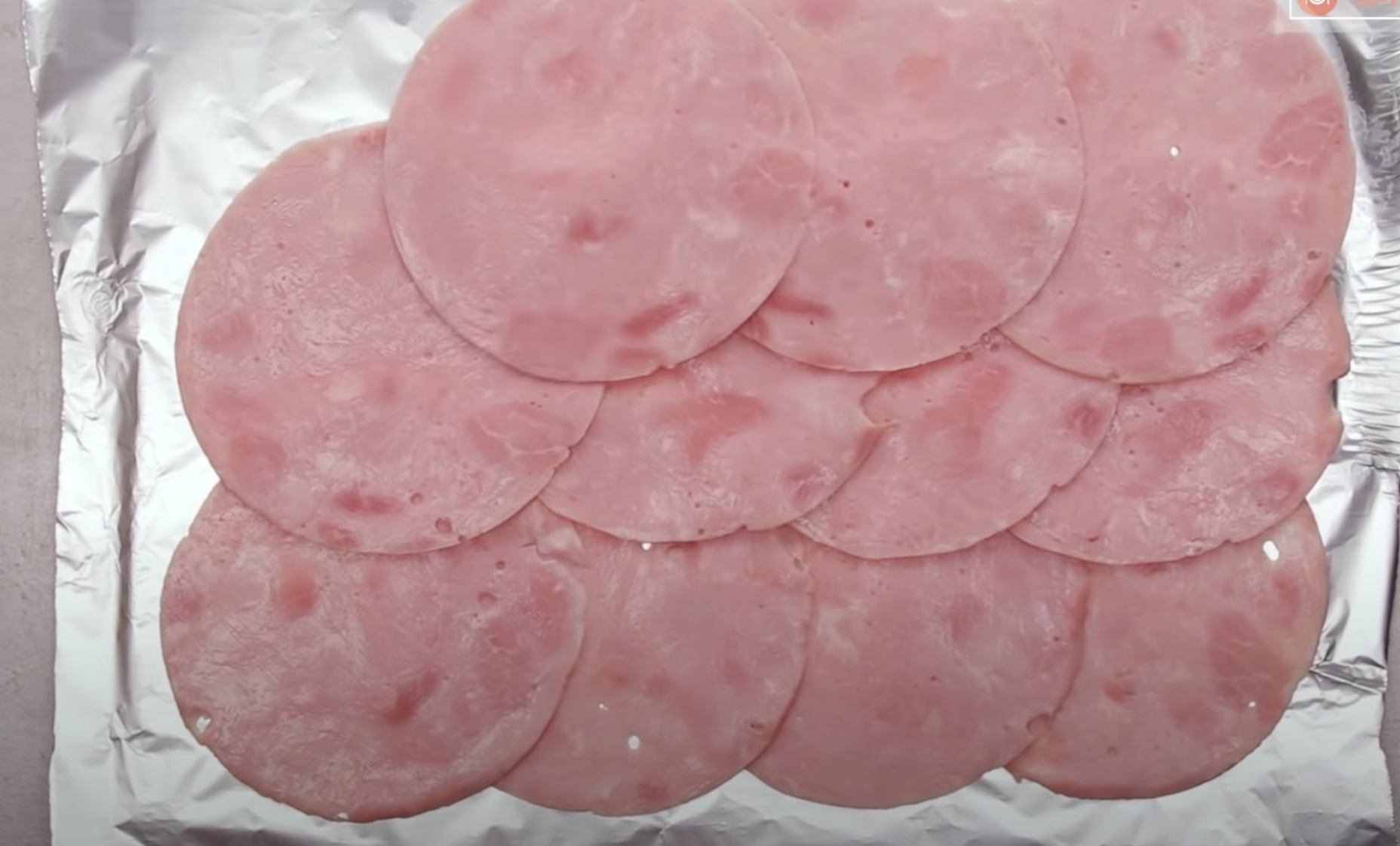 2. Teraz, poukładaj na niej plasterki szynki (tak jak na zdjęciu).