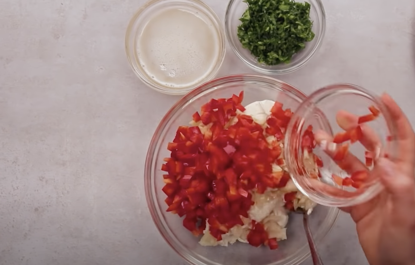 4. Następnie, dodaj pokrojone w kosteczkę marynowane pieczarki, drobno pokrojoną paprykę i posiekane zioła. Dokładnie wymieszaj.
