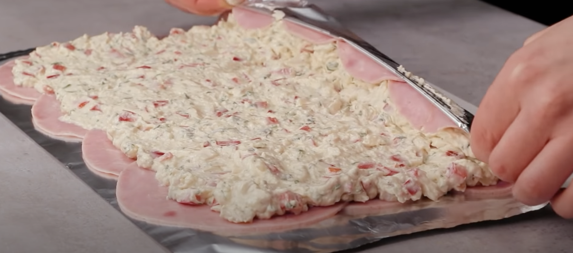 6. Na plastrach szynki, rozsmaruj nadzienie i zawiń ciasno w rulon, zabezpieczając folią aluminiową.
