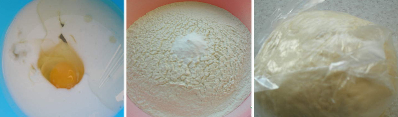 6. Wymieszaj przesianą mąkę z sodą, dodaj jajko i kefir. Mąkę dodawaj porcjami, aby ciasto było miękkie i elastyczne. Owiń gotowe ciasto folią spożywczą i odłóż na 30 minut.