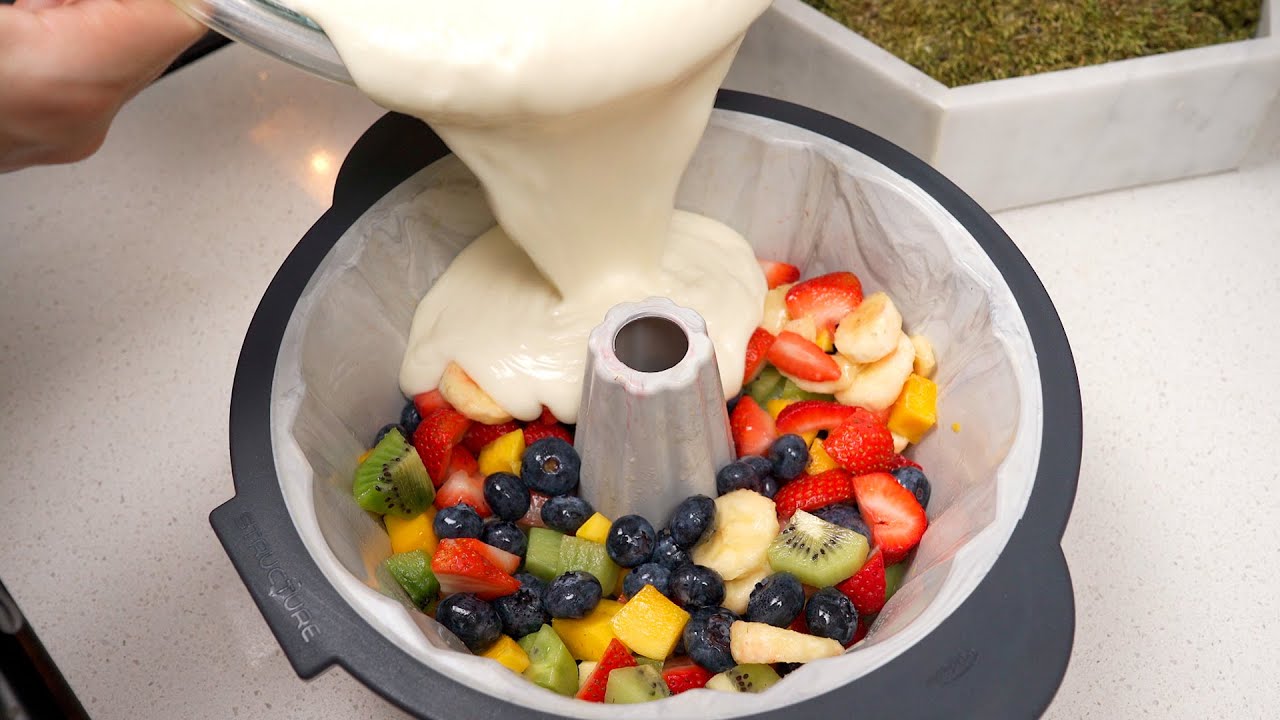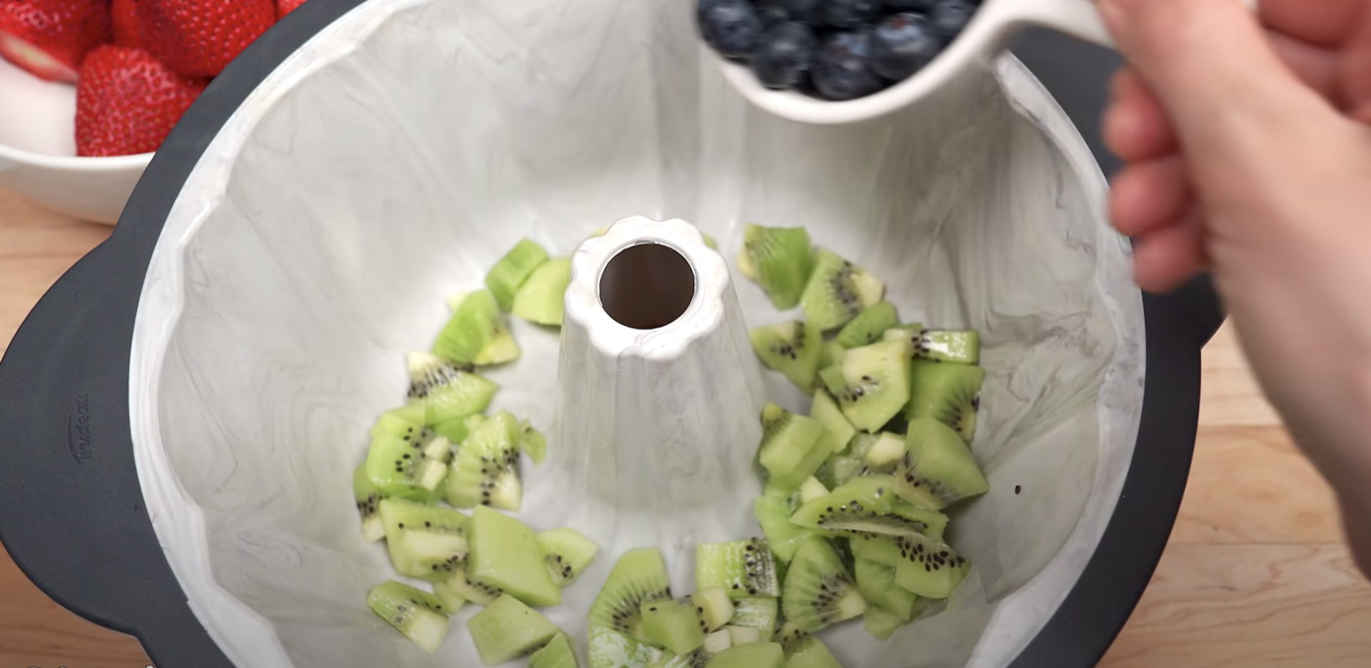 2.Omyte oraz obrane owoce pokrój na mniejsze kawałki. Gdy pokroisz banana, koniecznie skrop go odrobiną soku z cytryny. Używając formy silikonowej wkładaj pokrojone owoce.