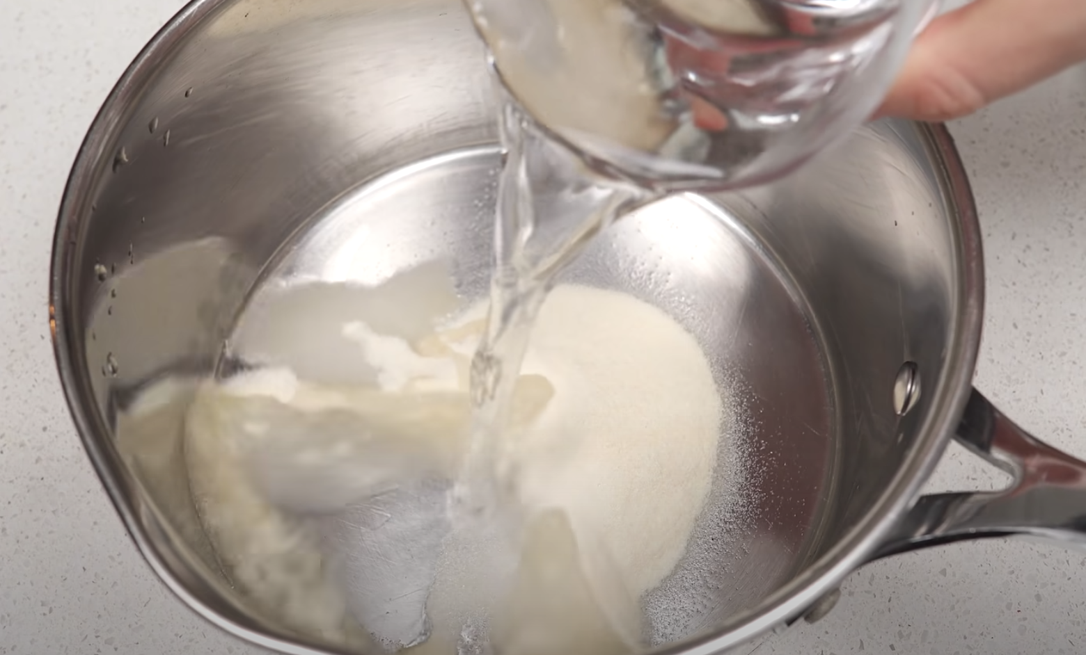 1.Do szklanki wsyp żelatynę, po czym zalej ją wodą i odstaw aby mogła stężeć.