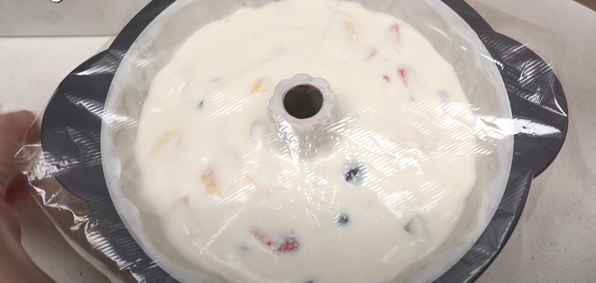 3.W misce wymieszaj śmietanę kremówkę z ekstraktem waniliowym oraz cukrem. Płynną żelatynę wlej do przygotowanej masy śmietankowej. Tak przygotowaną masą koniecznie zalej ułożone owoce, po czym starannie całość wygładź i przykryj całość folią spożywczą. Tak przygotowaną formę przechowuj w lodówce do całkowitego stężenia.