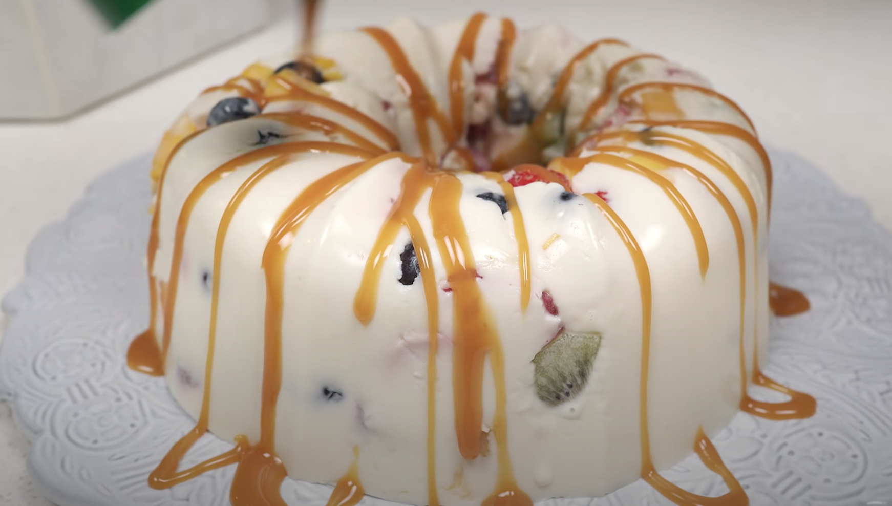 4.Gotowy deser wyjmij z formy i polej go lukrem karmelowym.