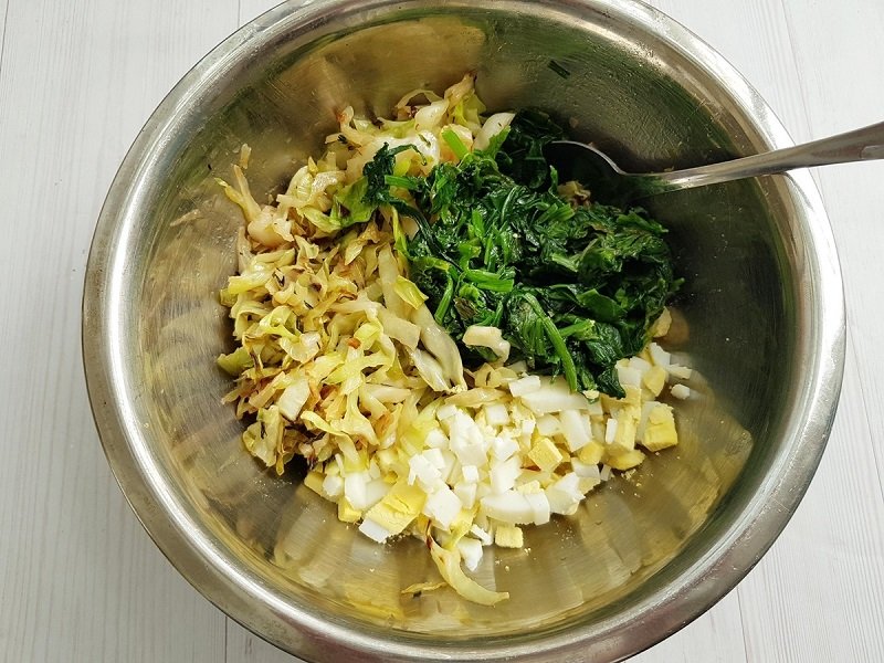3.W między czasie możesz przygotować farsz. Na samym początku dokładnie obierz cebulę, po czym drobno ją pokrój i smaż a patelni przez kilka minut, następnie dodaj do niej mrożony lub drobno pokrojony szpinak. W małym garnuszku ugotuj jedno jajko na twardo, następnie drobno je pokrój. Do miski przełóż podsmażony szpinak z cebulą, następnie dodaj do nich pokrojone jajko, wlej roztopione masła i przypraw do smaku solą , pieprzem, jak i ulubionymi ziołami, całość dokładnie połącz ze sobą.