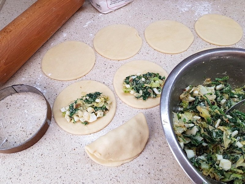 5.Każdy kawałek ciasta, koniecznie lekko rozwałkuj, po czym na sam środek układaj nie wielką porcje gotowego farszu szpinakowego. Staraj się je sklejać tak jak normalnego pieroga (patrz na zdjęcie poniżej). Blachę do pieczenie wyłóż papierem, po czym układaj z małymi odstępami wszystkie pierogi.