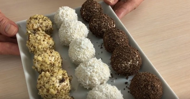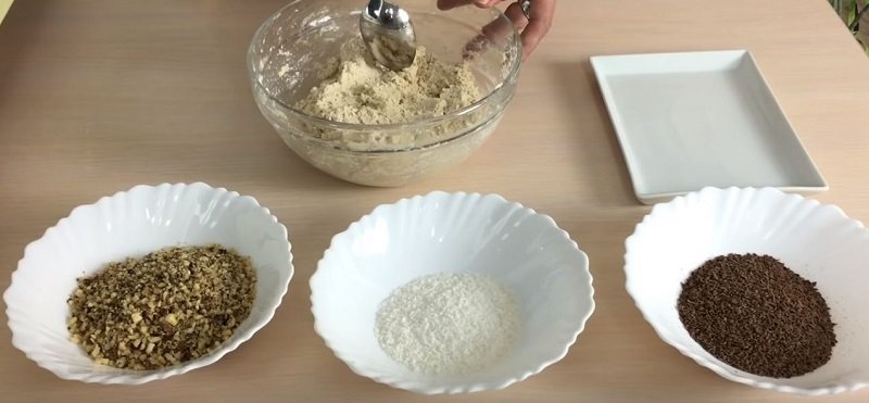 3. Teraz uformuj z masy małe kulki i obtaczaj w wiórkach kokosowych, czekoladowych i zmielonych orzechach. Obtoczone w kilku różnych posypkach, zachwycają pięknym i apetycznym wyglądem.