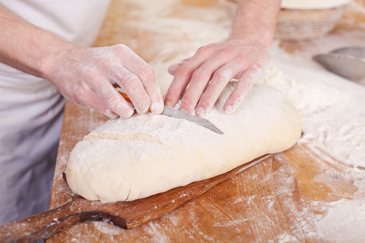 6. Ułóż ciasto na blaszkę, pokrytą papierem do pieczenia i wykonaj na nim nacięcia. Piecz w piekarniku rozgrzanym do 210–230 ℃ przez 30–35 minut.