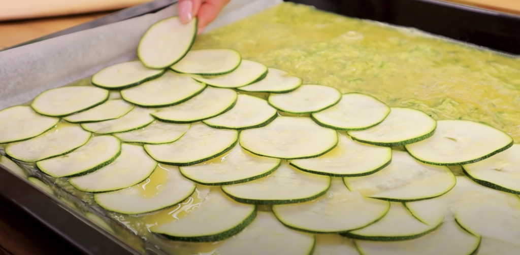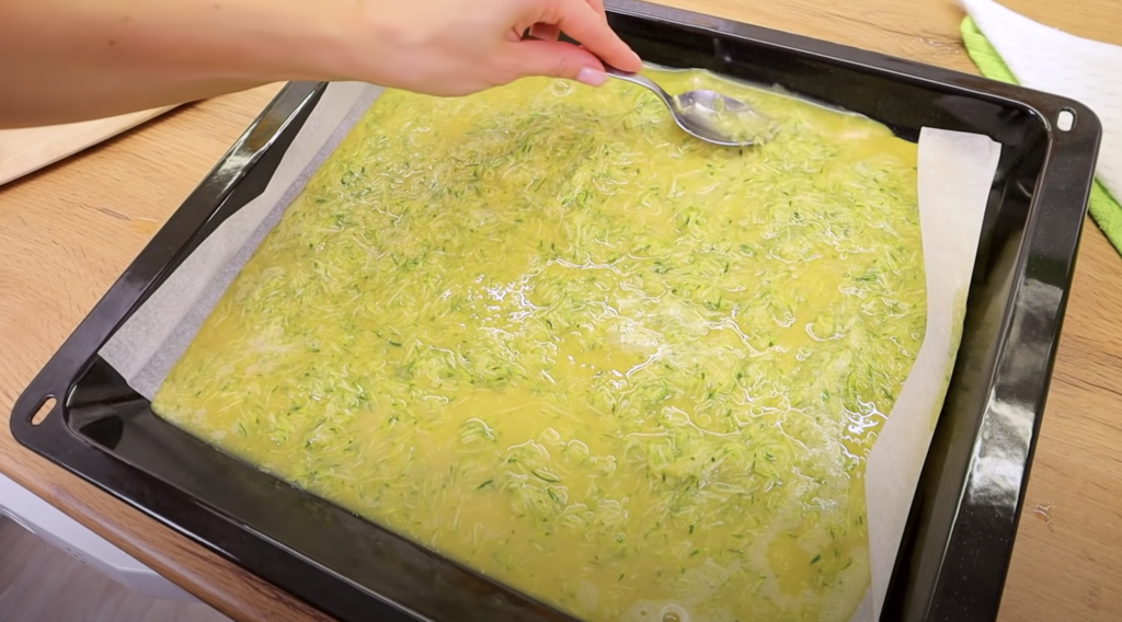 2. Potem weź drugą cukinię i pokrój ją w cienkie plastry. W dalszej części wyłóż blachę papierem do pieczenia i wylej na nią mieszankę cukiniowo – jajeczną.