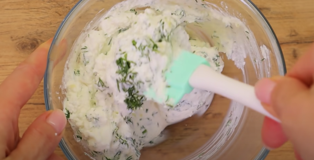 4. W czasie pieczenia przygotuj masę serową. W misce wymieszaj ser oraz przeciśnięty przez praskę czosnek. Dodaj pokrojony koperek i dopraw solą oraz pieprzem.