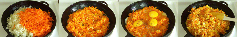 2.Obrobinę oleju rozgrzej na patelni. Potem przełóż wszystkie warzywa i przykryj patelnię pokrywką. Przez około 20 minut smaż co jakiś czas mieszając. W między czasie wlej odrobinę wody. Jak marchew będzie miękka dodaj 3 jajka. Do smaku przypraw solą oraz pieprzem. Przez niecałe 5 minut całość smaż.
