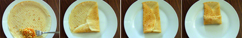 3.Gotowe nadzienie przełóż do miski, aby ostygło. Następnie posyp startym serem i dokładnie wymieszaj. W miedzy czasie możesz smażyć naleśniki. Gotowy farsz kładź na usmażonego naleśnika i zwijaj w kształt koperty ( jak na zdjęciu poniżej).