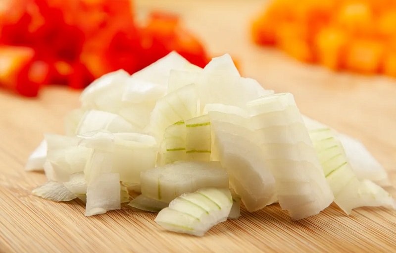 2.Obraną cebulę pokrój w piórka, następnie obierz marchew, którą za pomocą tarki zetrzyj na dużych oczkach, po czym pokrój w paski dokładnie umytą paprykę.