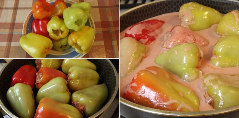 4. Przygotowanym nadzieniem, nafaszeruj papryki i poukładaj je ciasno w garnku z grubym dnem.
