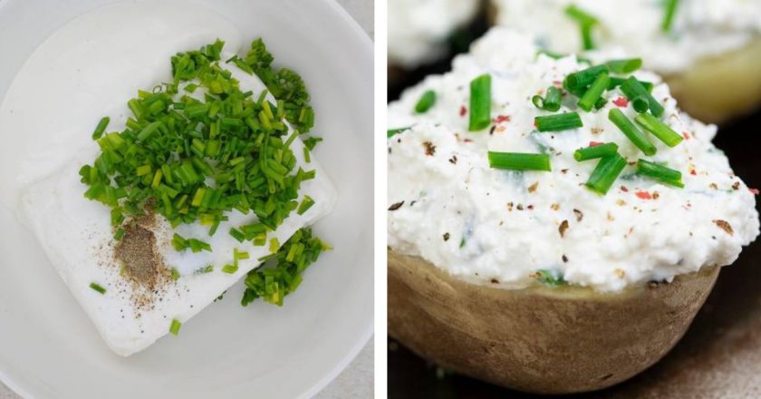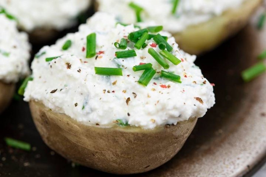 4. Ziemniaki wystudzone przekrój na pół, następnie połóż dużą porcję gzika na każdym z nich. To już wszystko!