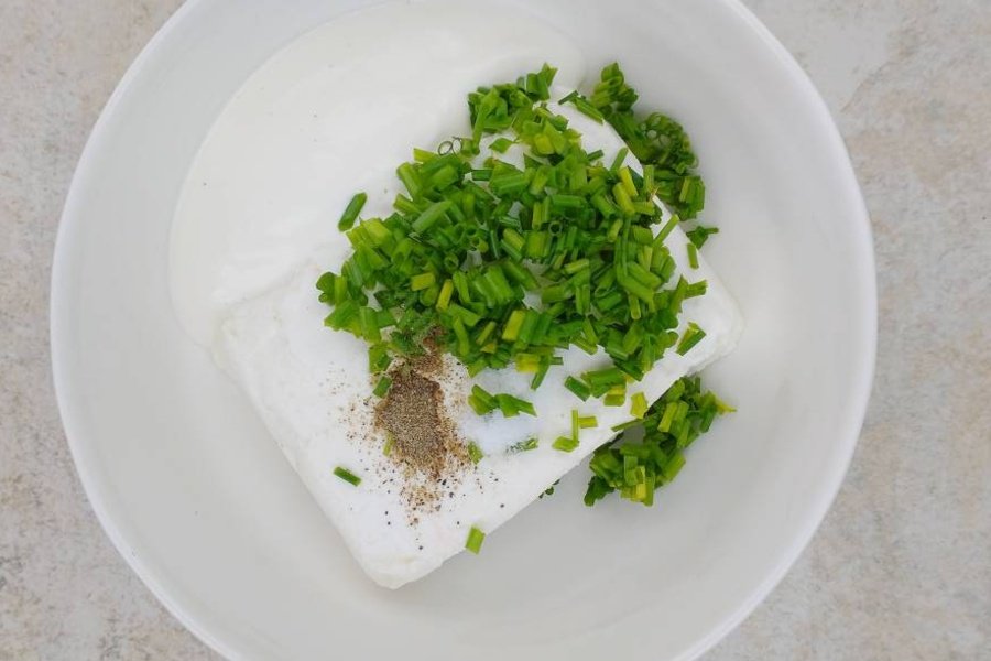 3. Przygotuj teraz gzika: Do miski włóż twaróg dodaj śmietanę oraz posiekany szczypiorek. Do smaku dopraw łyżeczką soli, szczypta cukru oraz ¼ łyżeczki pieprzu, wszystko dokładnie wymieszaj.