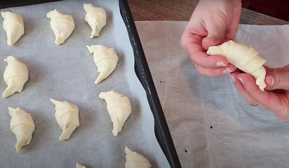 2.Na blaszkę połóż papier do pieczenia, po czym układaj przygotowane rogaliki, które dokładnie posmaruj mieszanką z jajka oraz mleka. Każdy rogalik dokładnie posyp sezamem. Następnie piecz przez 20 minut w rozgrzanym piekarniku do 180 stopni.