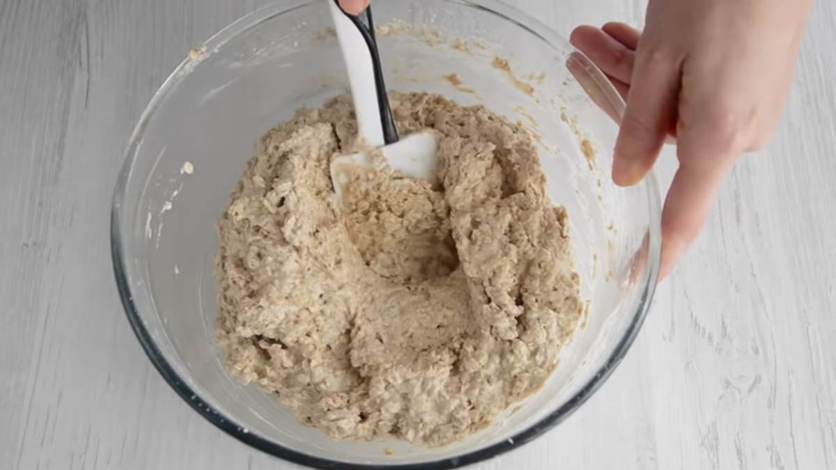 Połączyć suche składniki – do mąki dodać proszek do pieczenia, cynamon, płatki owsiane. Po wymieszaniu dodać je do masy powstałej po miksowaniu, powoli połączyć za pomocą szpatułki. Powstałe ciasto powinno być miękkie.