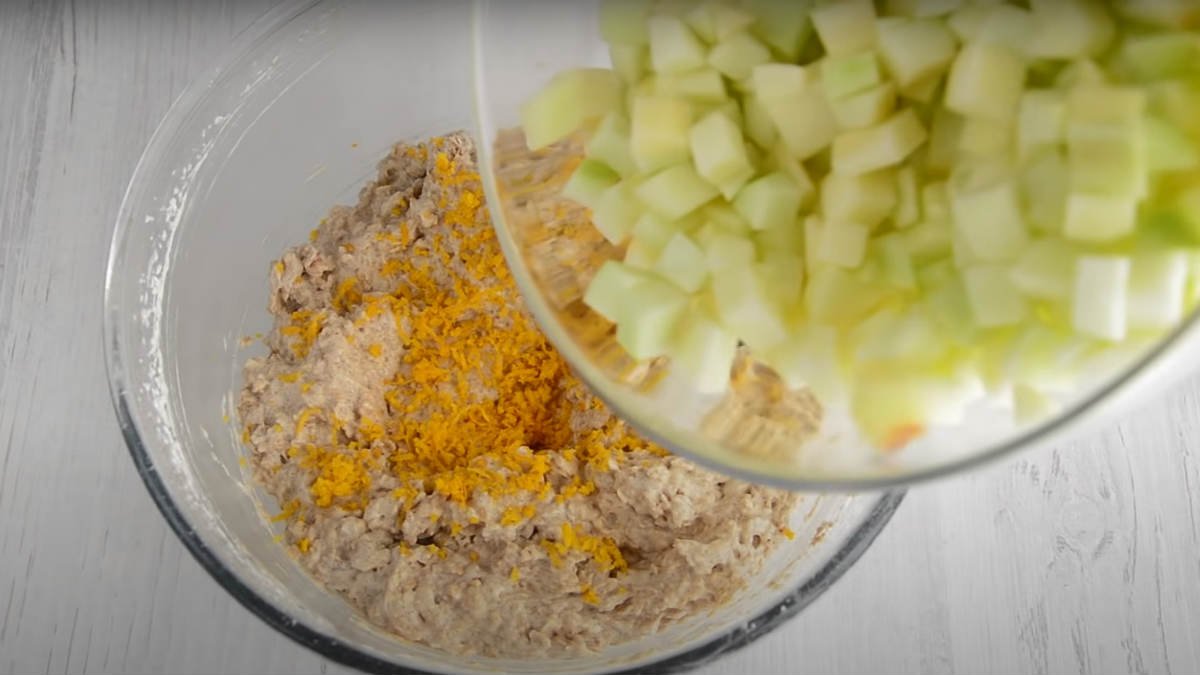 Kolejnym krokiem jest przygotowanie jabłek, które należy obrać ze skórki, pokroić w drobną kostkę i skropić sokiem z cytryny. Skórkę z cytryny zetrzeć i dodać wraz z jabłkami do ciasta, całość dokładnie wymieszać.